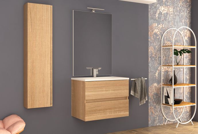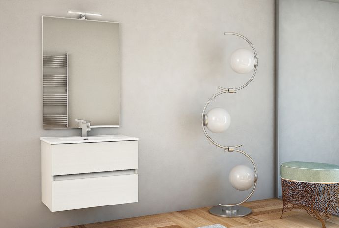 Mobile River. Design moderno grazie all’apertura dei cassetti con la maniglia “agola”, compatto e funzionale per arredare bagni di qualsiasi dimensione. Due ampi cassettoni dotati di sistema di chiusura soft ed un lavabo. Le caratteristiche: è largo 74 cm ed è disponibile in bianco o rovere.