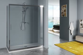 - Box doccia con apertura frontale a due ante scorrevoli e una fissa. L’ampia apertura angolare è consigliata per valorizzare piccoli vani doccia.